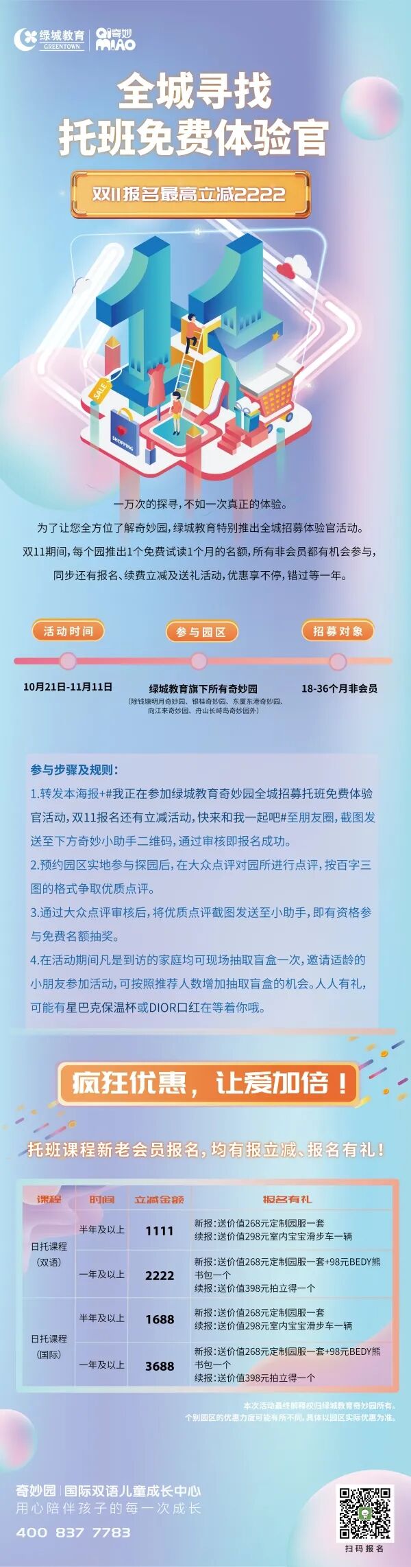 本次活动时间为10月21日-11月11日。绿城教育旗下全国所有奇妙园均参加此次活动!(除钱塘明月奇妙园、银桂奇妙园、东厦东港奇妙园、向江来奇妙园、舟山长峙岛奇妙园外。)